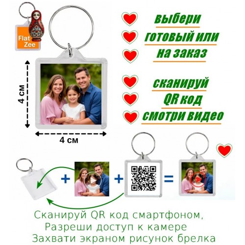 Фото и видео с близкими, родственниками (семейное). На "волшебном брелке ФлэтЗи" - с дополненной реальностью - просмотром оживающего видео по QR коду на задней стороне брелка.
